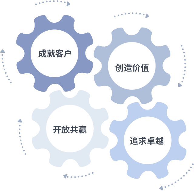 成就客户是一切决策的出发点,,,创造价值是衡量所有工作的标准,,,追求卓越是我们做事做人的态度,,,开放共赢是我们的格局也是最终的结果。。价值观的齿轮环环相扣,,,,推动着组织里的每个人不断向前。。。。